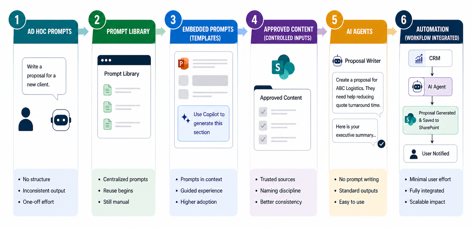 This evolution outlines a practical path from ad hoc AI usage to fully embedded, automated systems. It shows how teams move from experimentation to repeatable processes by introducing prompt libraries, embedding guidance into everyday tools, controlling inputs through approved content, and ultimately deploying agents and automation.